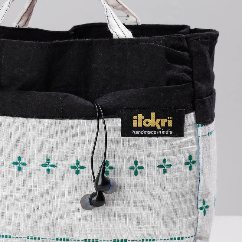 Handcrafted multipurpose cosmetic/Toiletry pouch. It has two simple pockets, one zipper pocket inside and four pockets on outside. This pouch is made from jacquard weave cotton fabrics with spill-proof plastic layer lining inside, textured with handmade textiles of India.