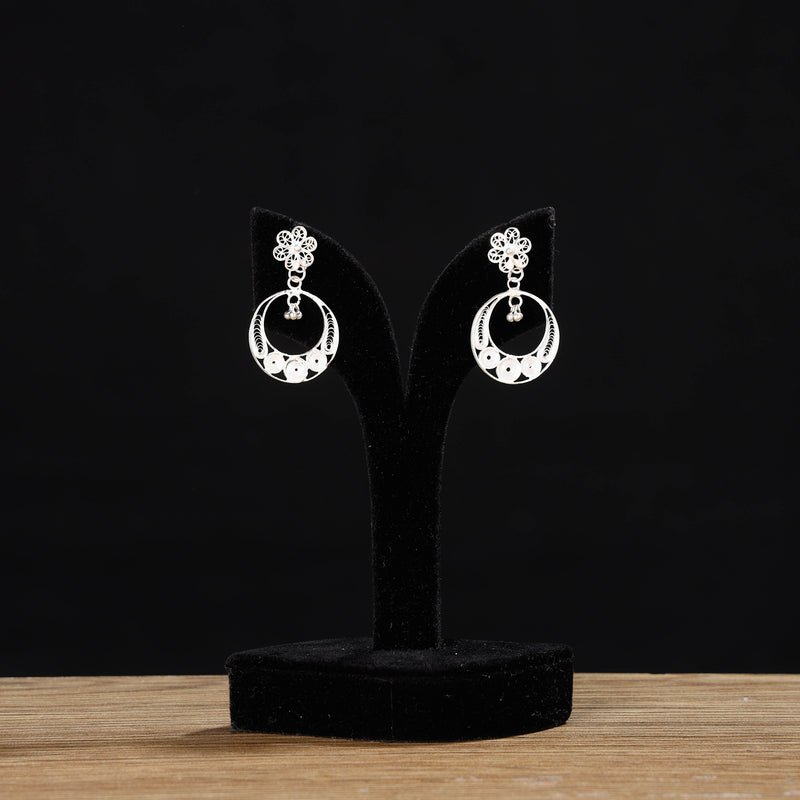 Hand-crafted filigree sterling silver earrings from Kalinga, Odisha. This product is made by artisans working traditionally with precious ornaments. (made of 92.5% sterling silver) Featuring an eye-catching design and excellent finish, these filigree silver earrings are a must-have in your accessory collection.