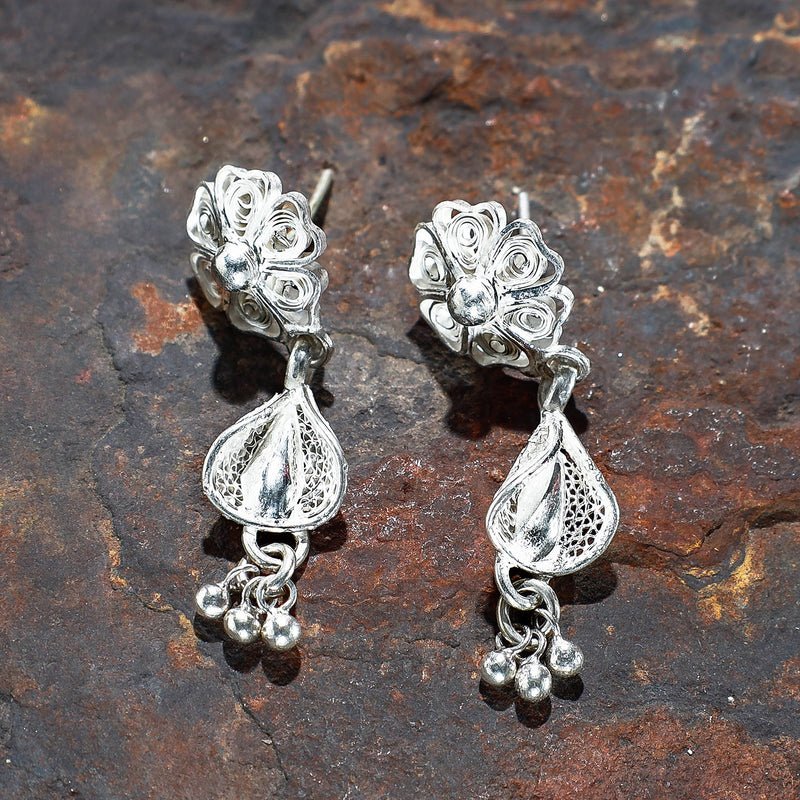 Hand-crafted filigree sterling silver earrings from Kalinga, Odisha. This product is made by artisans working traditionally with precious ornaments. (made of 92.5% sterling silver) Featuring an eye-catching design and excellent finish, these filigree silver earrings are a must-have in your accessory collection.