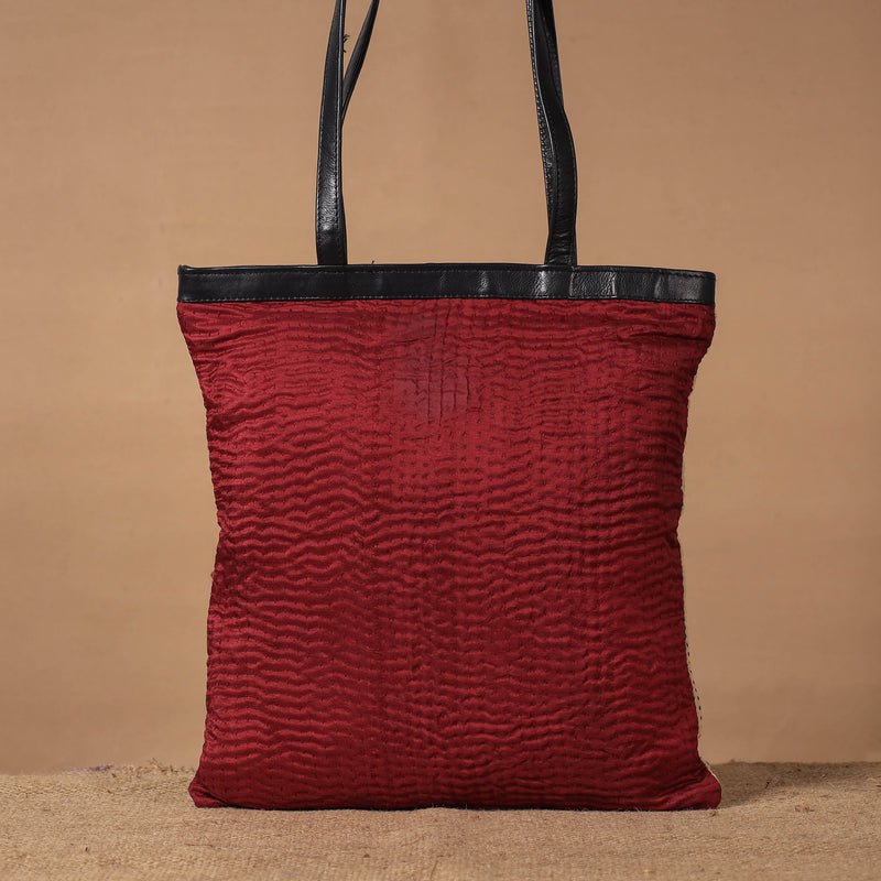 Handcrafted kantha heavy hand embroidered shoulder bag with leather handle made from cotton fabric on front side and art silk fabric on backside. Designed with contemporary patterns and has been hand embroidered using West Bengaland#39;s traditional craft technique of Kantha. It has one simple and one zipper pocket inside. Ample space to keep most of your essentials.