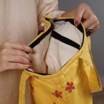 This shoulder bag is made from silk-cotton fabric with soft foam inside. It is designed with contemporary patterns and hand embroidered using the Uttarakhand traditional craft technique of Kantha Tagai using thread yarns. It has a zip pocket inside.