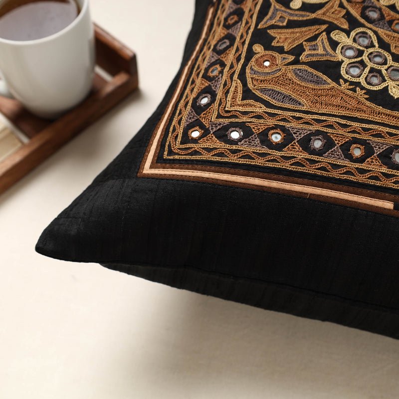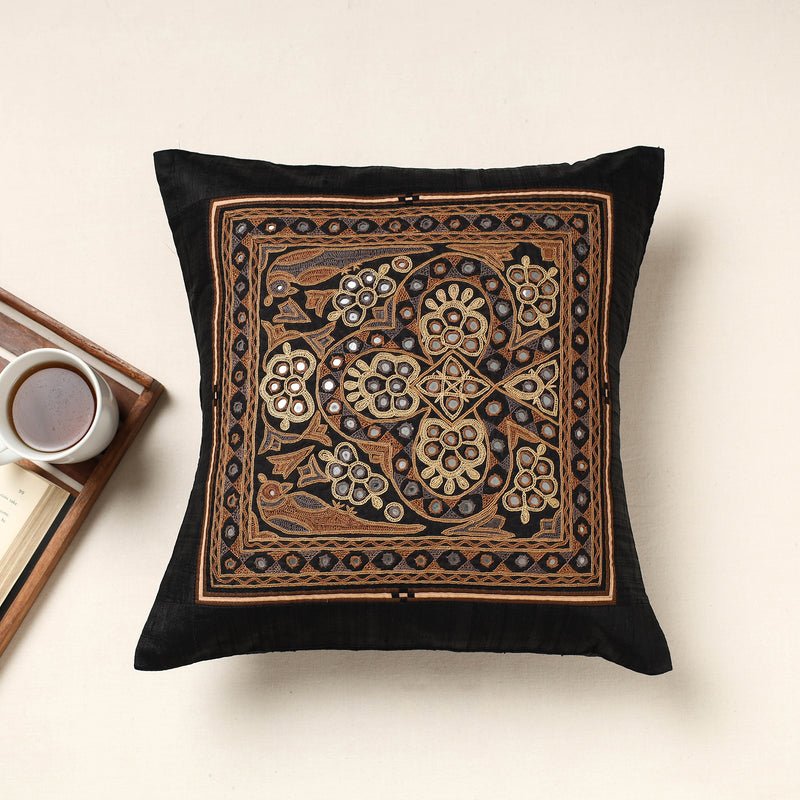 Kutch Ahir Hand Embroidery Silk Cushion Cover (16 x 16 in)