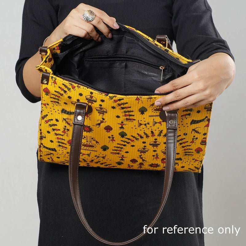 This handcrafted shoulder bag with a toilet pouch is made from printed cotton fabric and rexine. It has two zipper pocket inside with ample space to keep most of your essentials.