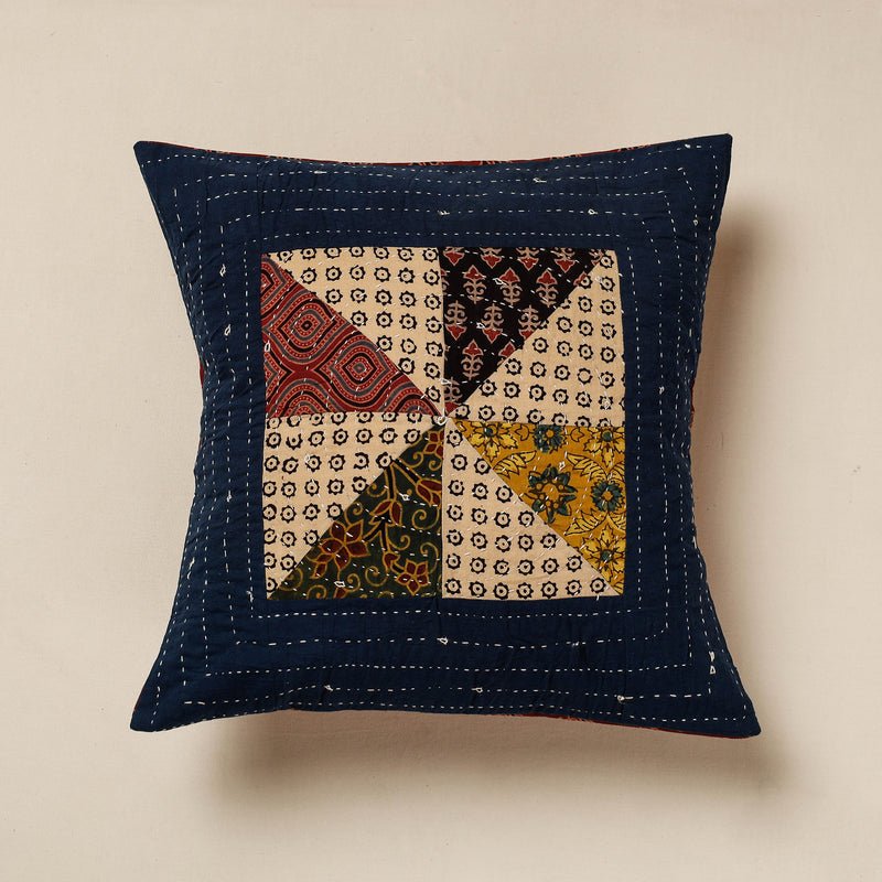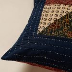 This cushion cover features a unique blend of traditional and contemporary styles. Made from ajrakh block printed mashru silk patchwork fabrics, it is embellished with hand embroidery using the kutchhi kantha technique by the skilled artisan Ramji Devraj. Customised designs and colors possible for a small batch production of 100 pieces. Product and material testing reports available on request.