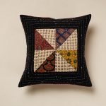 This cushion cover features a unique blend of traditional and contemporary styles. Made from ajrakh block printed mashru silk patchwork fabrics, it is embellished with hand embroidery using the kutchhi kantha technique by the skilled artisan Ramji Devraj. Customised designs and colors possible for a small batch production of 100 pieces. Product and material testing reports available on request.