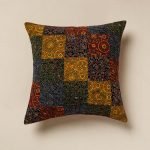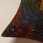 This cushion cover features a unique blend of traditional and contemporary styles. Made from ajrakh block printed mashru silk patchwork fabrics, it is embellished with hand embroidery using the kutchhi kantha technique by the skilled artisan Ramji Devraj. Customised designs and colors possible for a small batch production of 100 pieces. Product and material testing reports available on request.