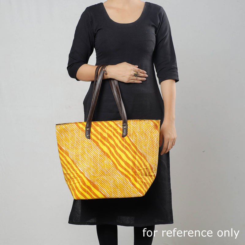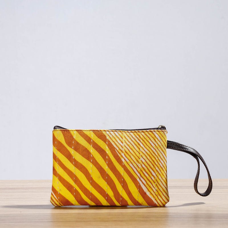 This handcrafted kantha work shoulder bag with a toilet pouch is made from printed silk fabric and rexine. It has one zipper pocket inside with ample space to keep most of your essentials.