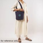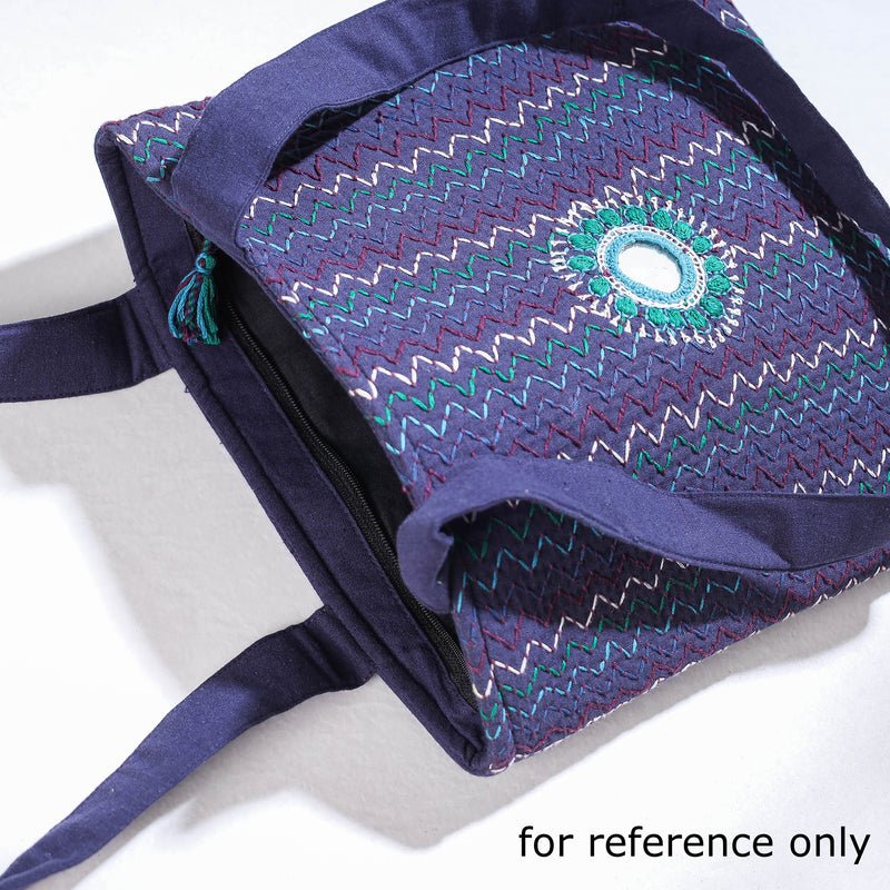 This shoulder bag is handcrafted from cotton fabric and features intricate mirror work hand embroidery. It has a cotton fabric lining with one simple pocket and one zipper pocket inside, providing ample space for all your essentials.