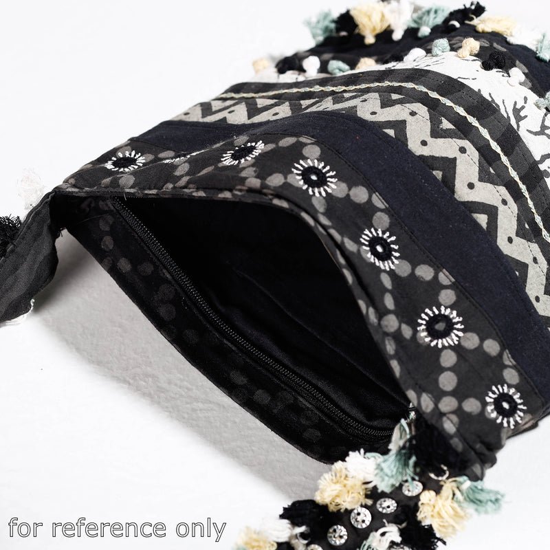 Elevate your style with this exquisite lambani mirror work hand embroidery patchwork cotton shoulder bag. This bag is made by a trible woman called Lambani at Sandur Cluster, near Hampi, Karnataka. It has cotton fabric layer inside. It has one zipper and one simple pocket inside, and it has enough space to keep most of your essentials. Perfect for adding a touch of elegance to any outfit while keeping your belongings safe and secure.