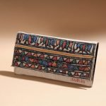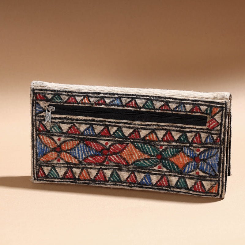 This Madhubani clutch is made from jute cotton and handpainted with representations of traditional Mithila art by Ruchi Jha from Bihar. It has four card slots, one zipper and one simple pocket with spill-proof plastic layer lining inside and one zipper pocket on backside.