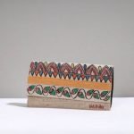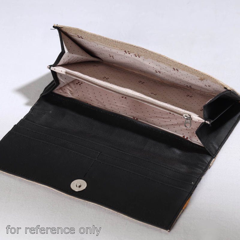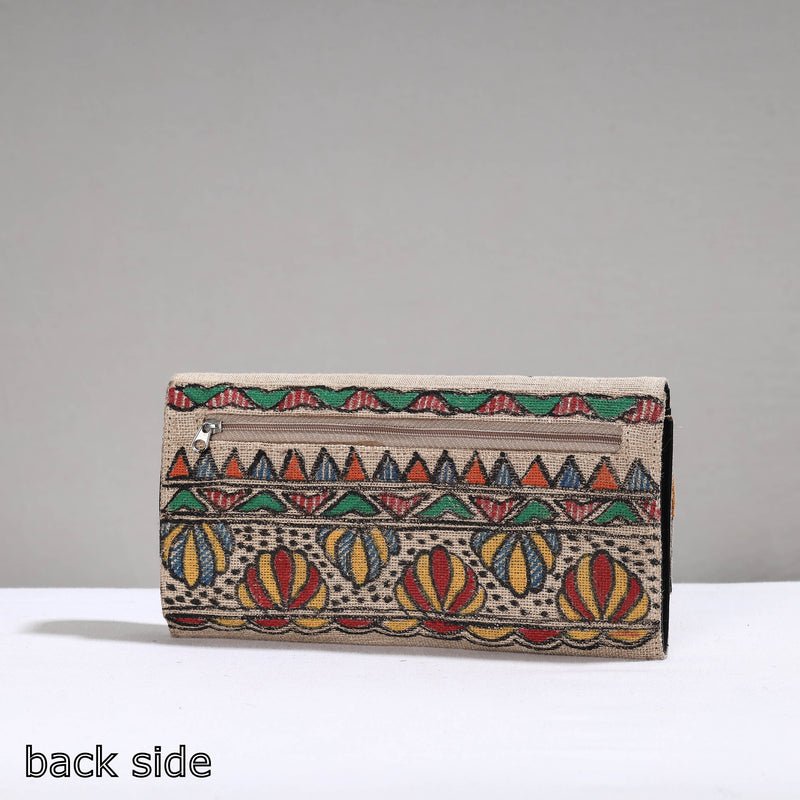 This Madhubani clutch is made from jute cotton and handpainted with representations of traditional Mithila art by Ruchi Jha from Bihar. It has four card slots, one zipper and one simple pocket with spill-proof plastic layer lining inside and one zipper pocket on backside.