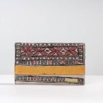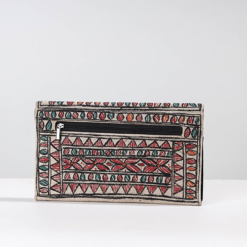 This Madhubani clutch is made from jute cotton and handpainted with representations of traditional Mithila art by Ruchi Jha from Bihar. It has four card slots, one zipper and one simple pocket with spill-proof plastic layer lining inside and one zipper pocket on backside.
