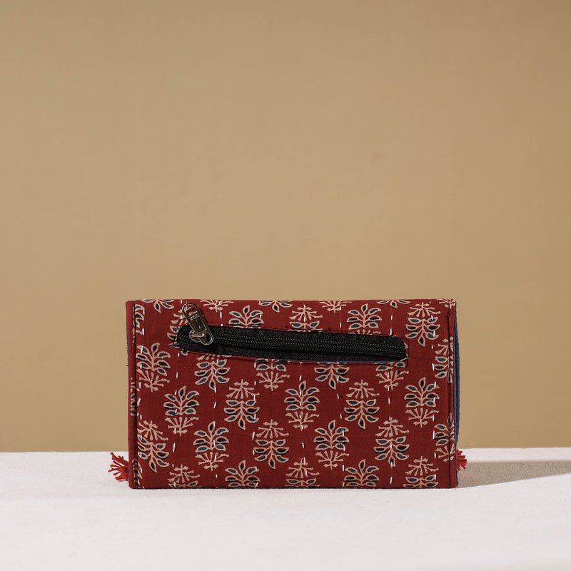 This handcrafted clutch wallet/sling bag is made from ajrakh hand-block printed cotton fabric sourced from Marudhara, Barmer. It features lovely tassels and has one interior and one exterior zipper pocket, providing le space to carry your essentials. Stay organized and fashionable with this unique and practical bag.