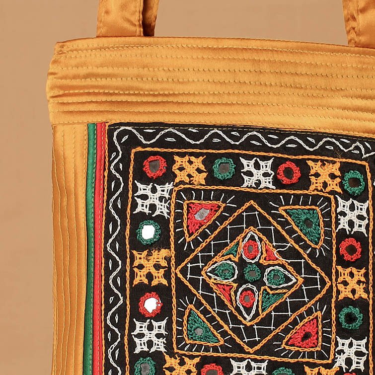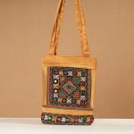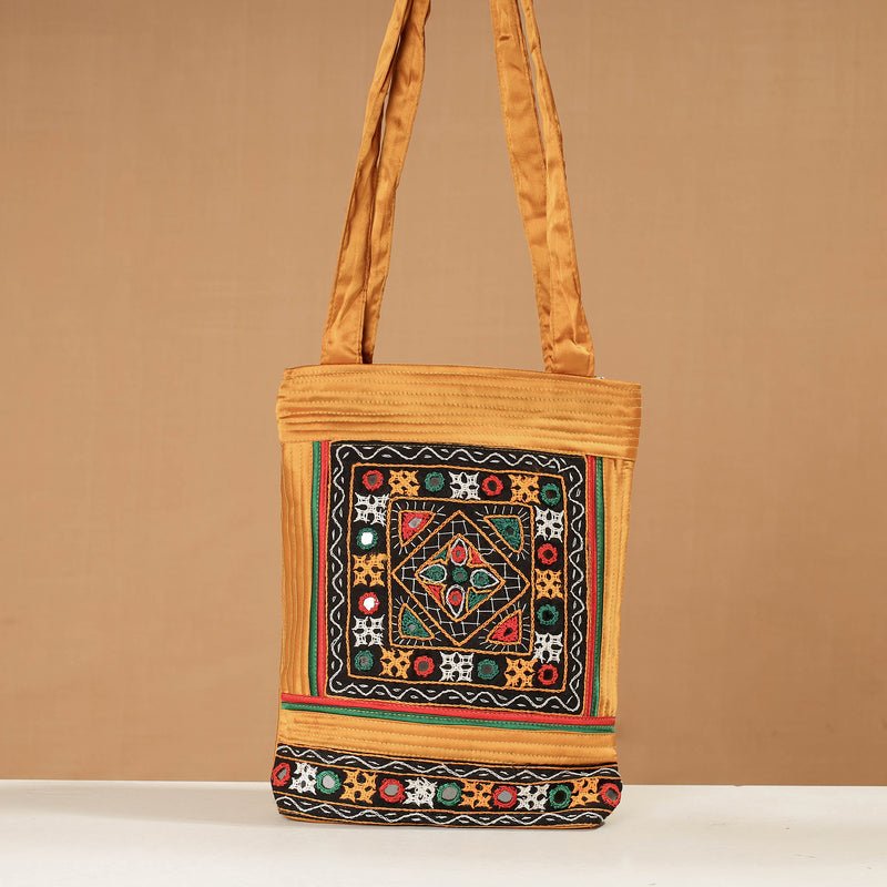 This handcrafted mirror work embroidered mashru silk shoulder bag is made from mashru silk fabric. It has one simple pocket inside and one simple or zipper pocket outside. This bag provides ample space for your essentials.