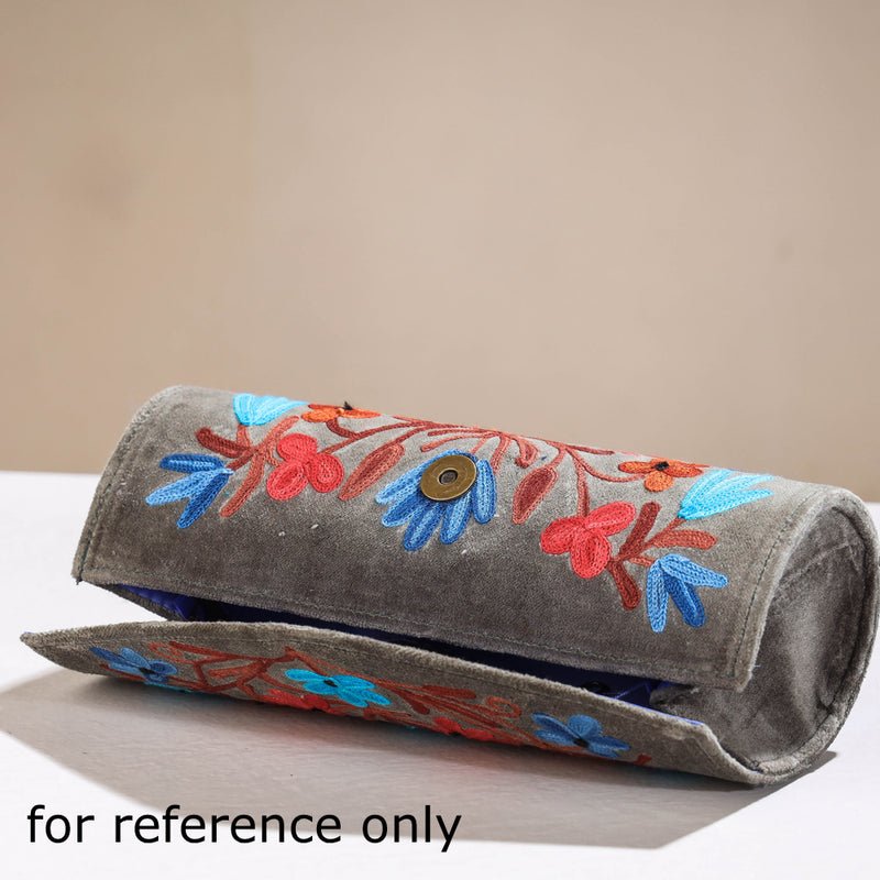 The Clutch is made from embroidered velvet fabric. It has two zipper pockets inside. Ample space to keep most of your essentials. The hallmark of this clutch is the fine quality of chain stitch crewel hand embroidery, a 1000 year old art practised till date in Kashmir. The embroidery is done normally using wool or silk yarn. A wide variety of different embroidery stitches are used to follow a design outline applied to the fabric.
