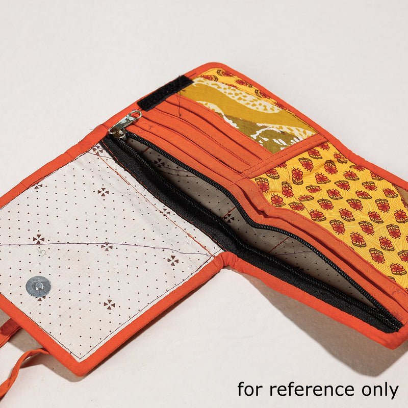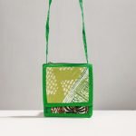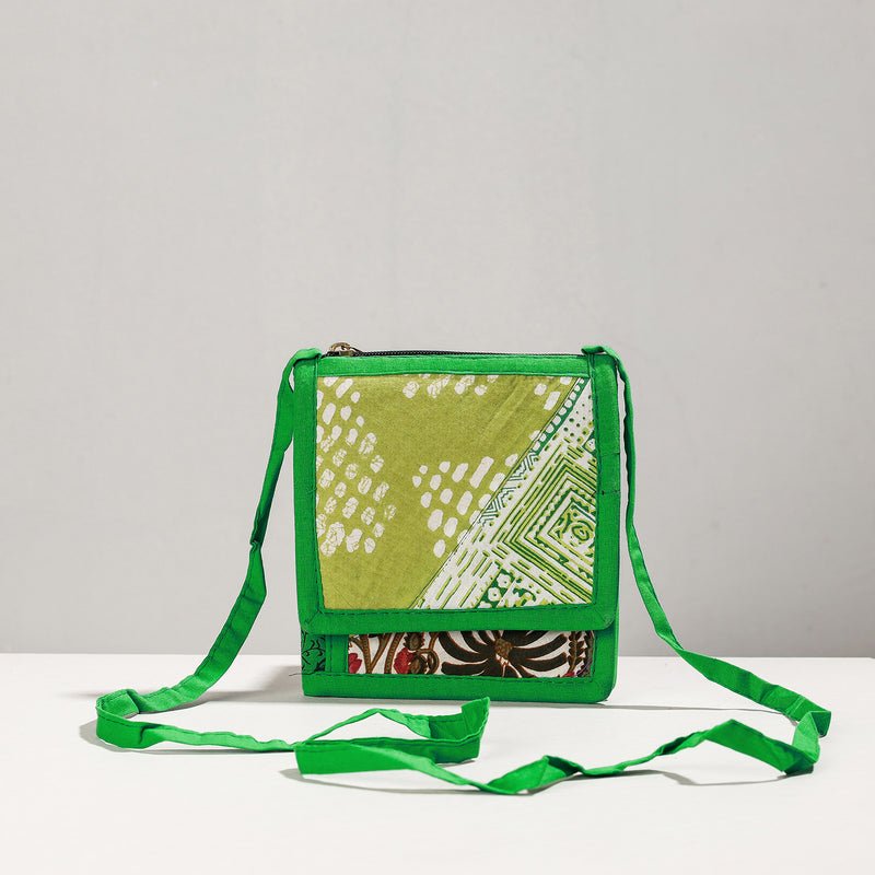 This patchwork design sling wallet is made from upcycled Jute and Cotton material. It has three card slots, two zipper pockets (one inside and one outside) and two simple pockets inside. Has a velcro closure.