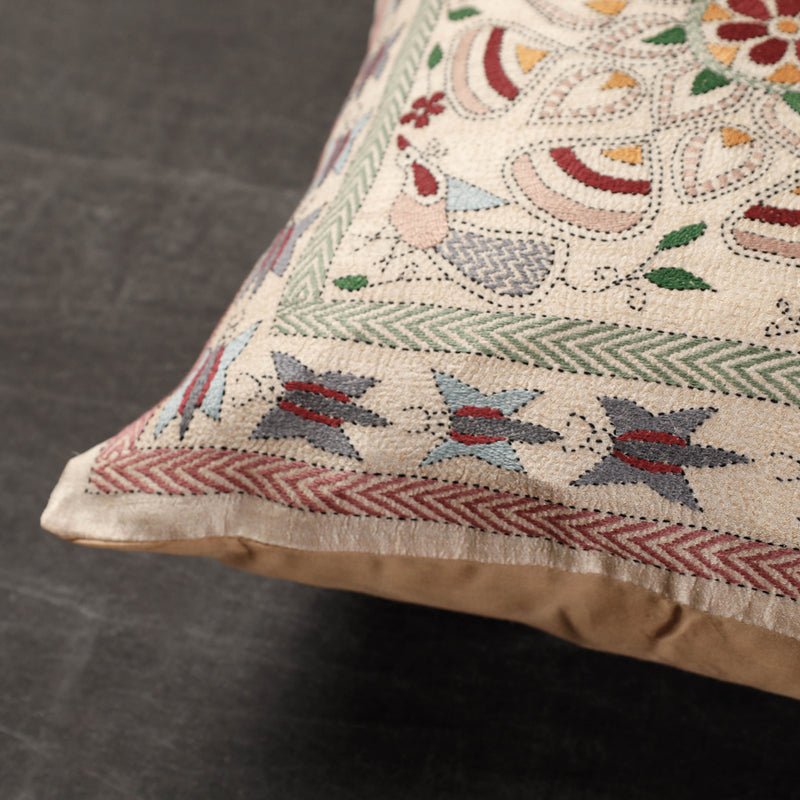 Home All Categories Home Furnishing Cushion Covers Peacock Kantha Embroidery Tussar Silk Cushion Cover (16 x 16 in)