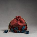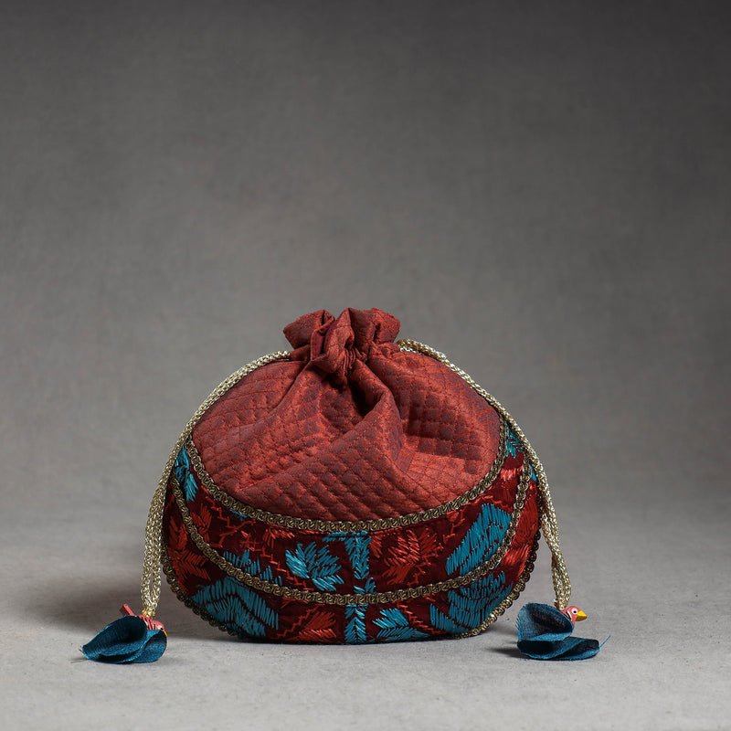 These exclusive Potlis are made from hand block printed silk fabric.They are adorned with adorned with exquisite phulkari embroidery and delicate gota work. The inside layering is done using foam and cotton. Beaded tasselled drawstrings are used for providing closure. Best suited for festival gifting, wedding and other traditional occassions. Color, design, size are customizable if the order quantity is 36 or more pieces.
