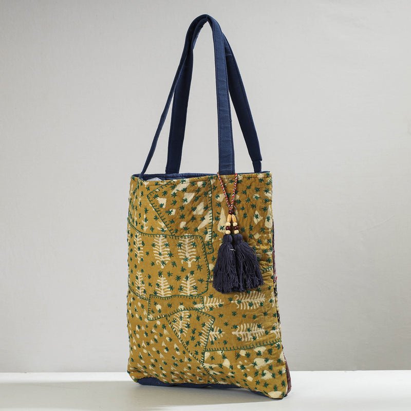 This handcrafted shoulder bag features a unique patchwork design made from hand block printed cotton fabric sourced from Marudhara, Barmer. With a charming bag charm and a simple interior pocket, it offers ample space to carry your daily essentials.