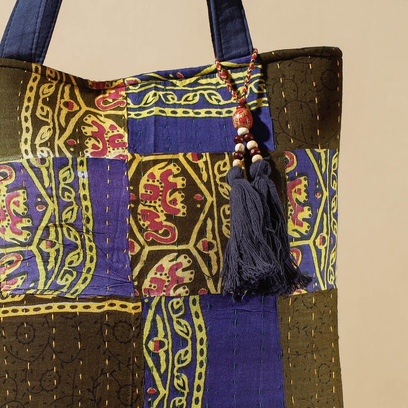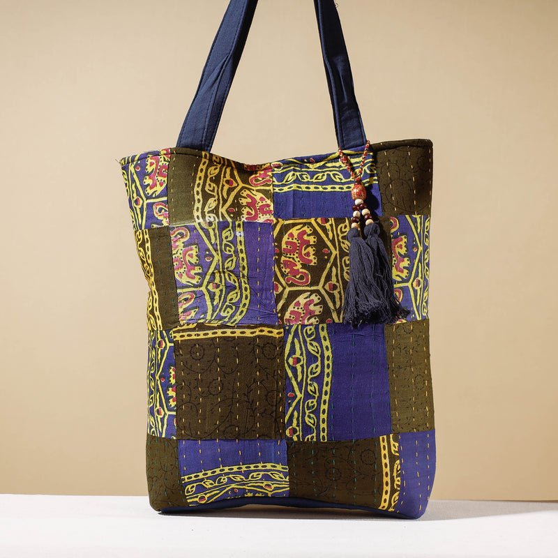 This handcrafted shoulder bag features a unique patchwork design made from hand block printed cotton fabric sourced from Marudhara, Barmer. With a charming bag charm and a simple interior pocket, it offers ample space to carry your daily essentials.