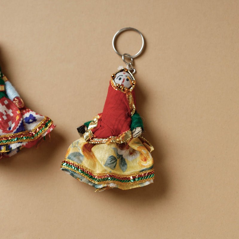 These handrafted Rajasthani puppet couple keychain are made from cotton fabric and adorned with intricate gota patti work. These miniature craft pieces are made by expert artisans from Rajasthan. Customised shapes and designs possible even for a small batch size of 100 units.