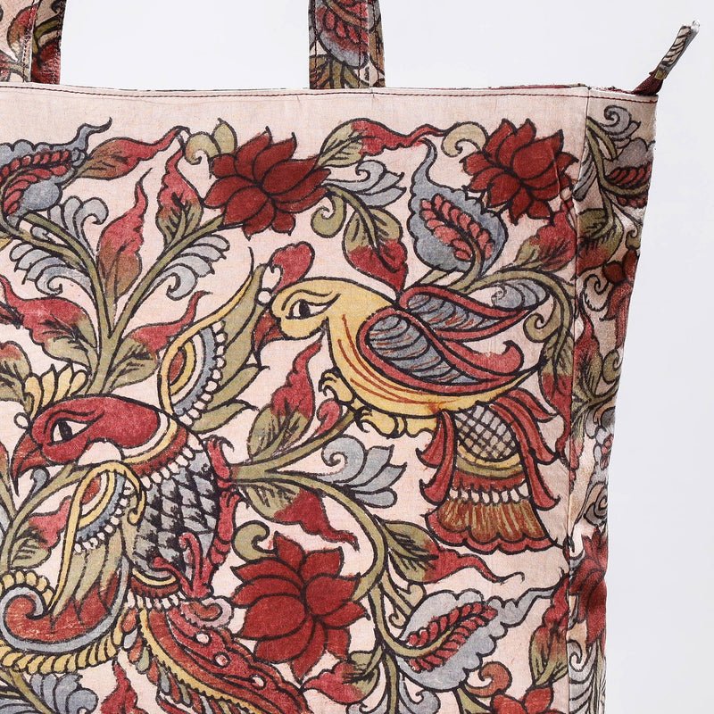 Hand-painted kalamkari natural dyed cotton shoulder bag. It has one zipper pocket inside. This exquisite shoulder bag is created with Hand-painted kalamkari work, wherein the kalam or pen is used for free hand drawing of the subject and filling in the colours. It is entirely hand worked using natural colours.