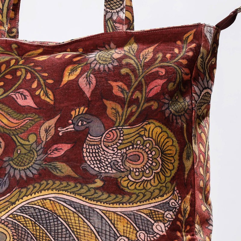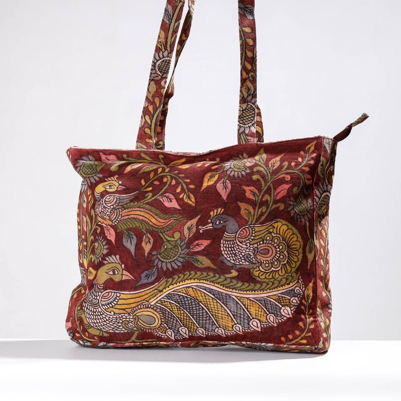 Hand-painted kalamkari natural dyed cotton shoulder bag. It has one zipper pocket inside. This exquisite shoulder bag is created with Hand-painted kalamkari work, wherein the kalam or pen is used for free hand drawing of the subject and filling in the colours. It is entirely hand worked using natural colours.
