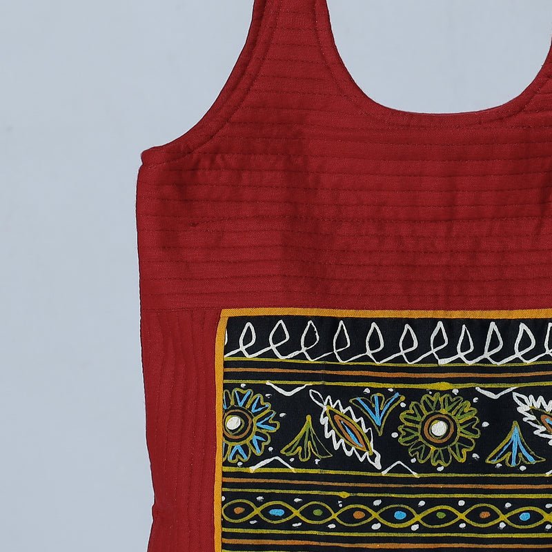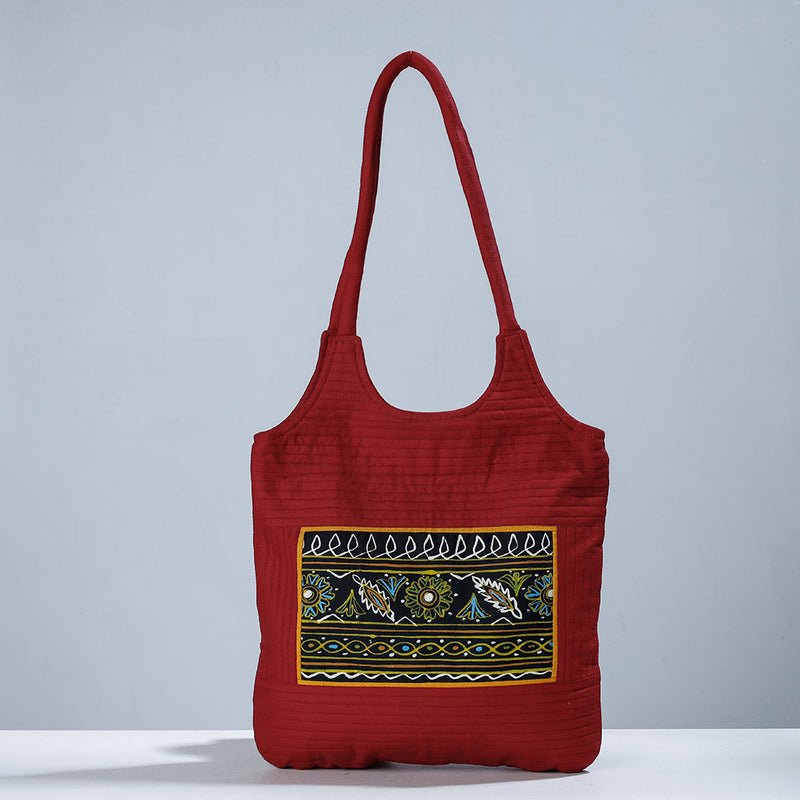 Fine quality mashru cotton with traditional rogan art hand-painted shoulder bag. Has one zipper pocket with cotton fabric lining inside, ample space to keep most of your essentials. Made by the master artisan Jabbar Khatri from Nirona in Kutch region of Gujarat. The Rogan art of painting is an ancient art over three hundred years old. The traditional Rogan flower motifs and designs speak of a Persian influence and the word Rogan itself means oil-based in Persian. Today, Nirona in Kutch is the only place where this work is created. When castor oil is heated over fire for more than twelve hours and cast into cold water, it produces a thick residue called rogan, which is mixed with natural colours obtained from the earth. With a six-inch wooden stick or pen, the craftperson then draws out from this a fine thread which is painted to the cloth. Rogan painting is delicately and precisely painted from oneand#39;s own creative imagination and is done with total concentration sitting on the floor without using a table-frame or any outline.