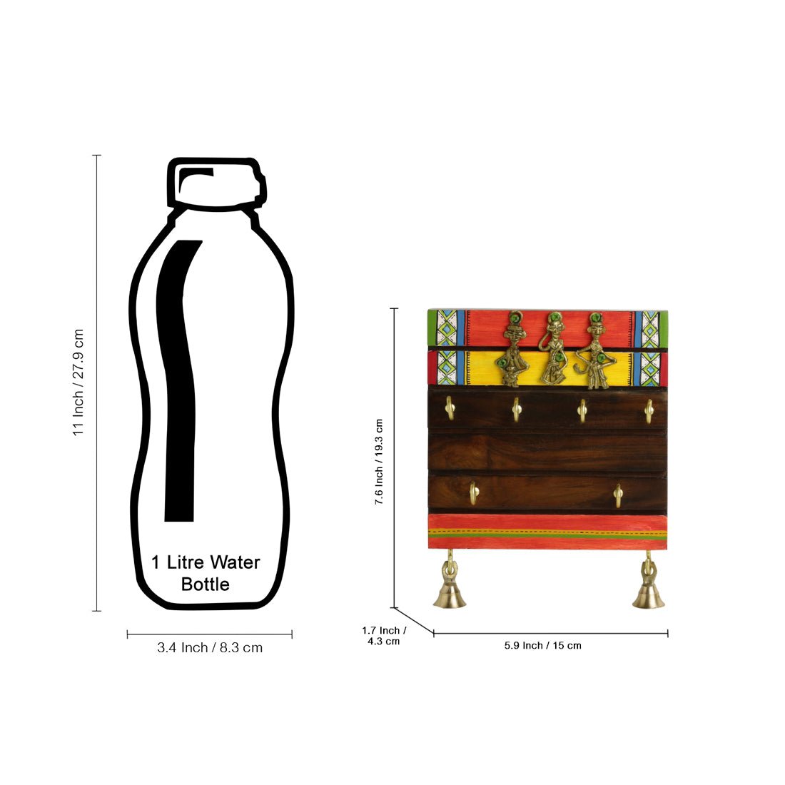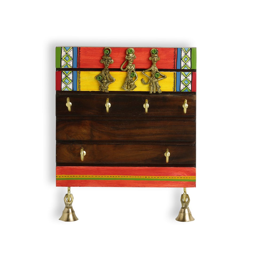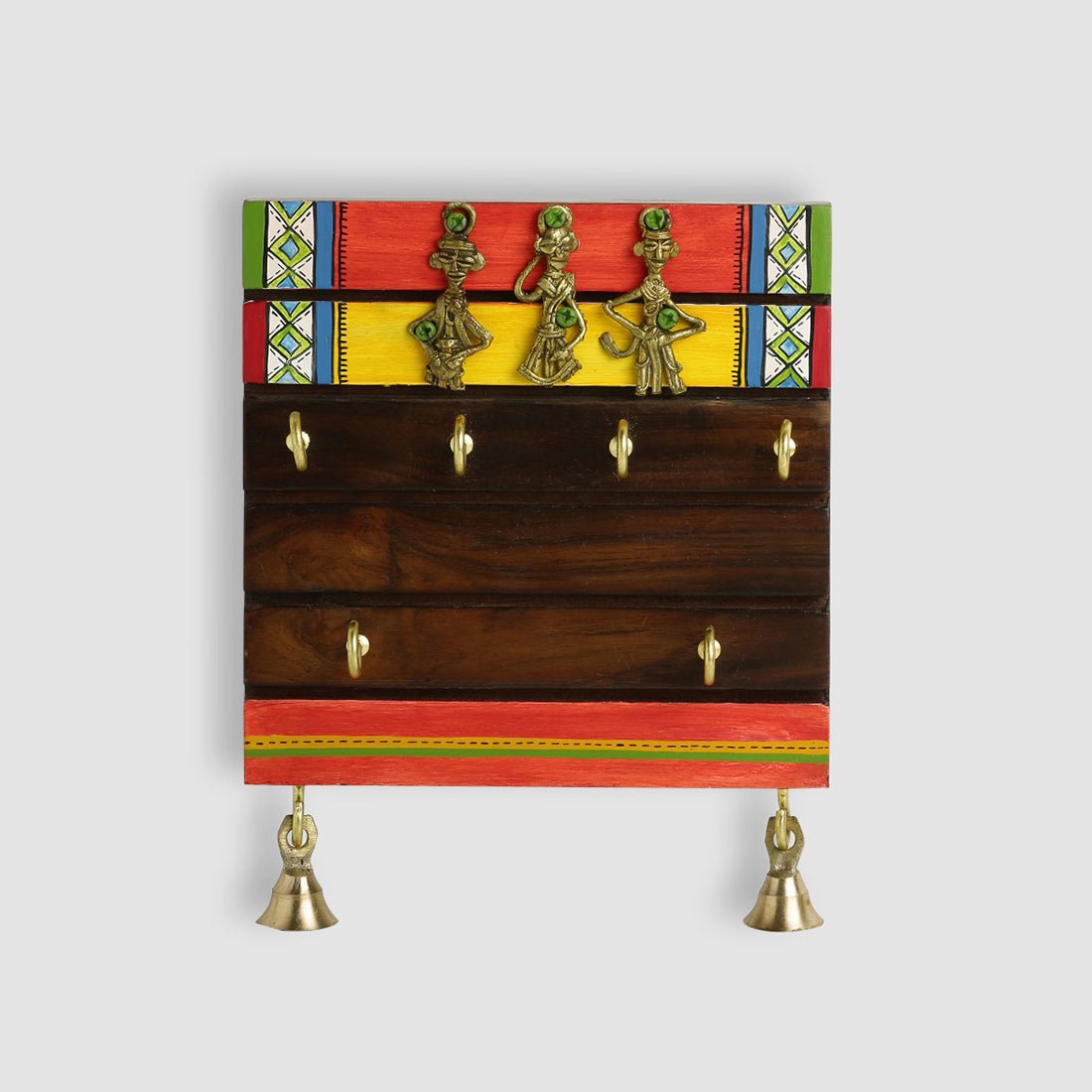 Warli Hand-Painted Dhokra Key Holder In Sheesham Wood (6 Hooks)